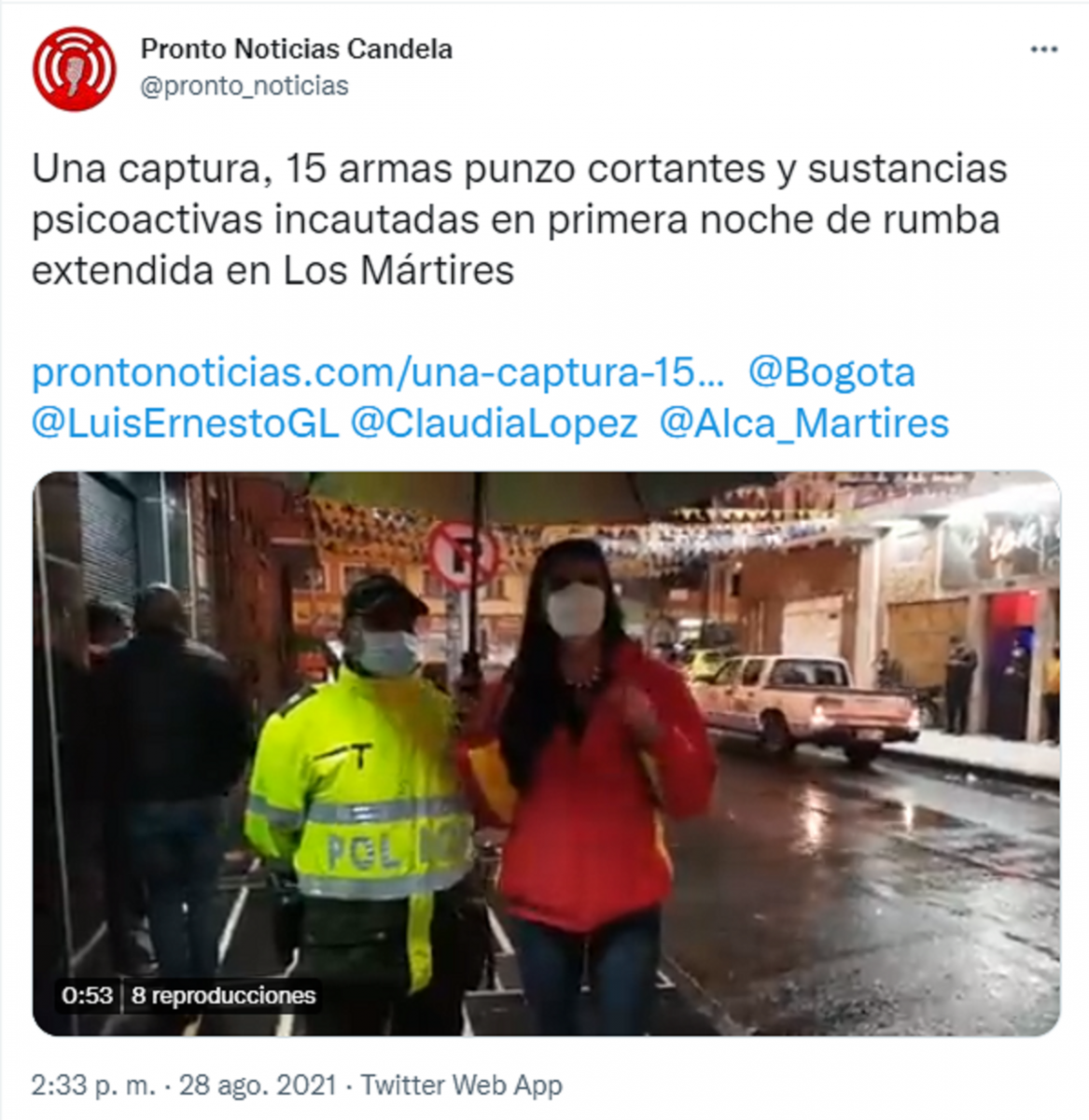 Una captura, 15 armas punzo cortantes y sustancias psicoactivas incautadas en primera noche de rumba extendida en Los Mártires.