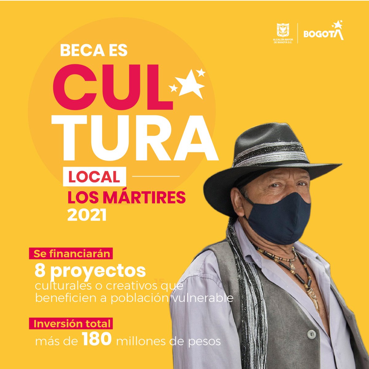 Esta segunda versión de Es Cultura Local ofrece la Beca es Cultura Local – Localidad de los Mártires 2021, que surge como respuesta a la necesidad de generar alternativas que permitan mejorar las capacidades de gestión y aportar a la recuperación de los encadenamientos productivos locales, promoviendo una oferta de bienes y servicios encaminados a la reactivación económica del sector cultural y creativo de la localidad de Los Mártires.