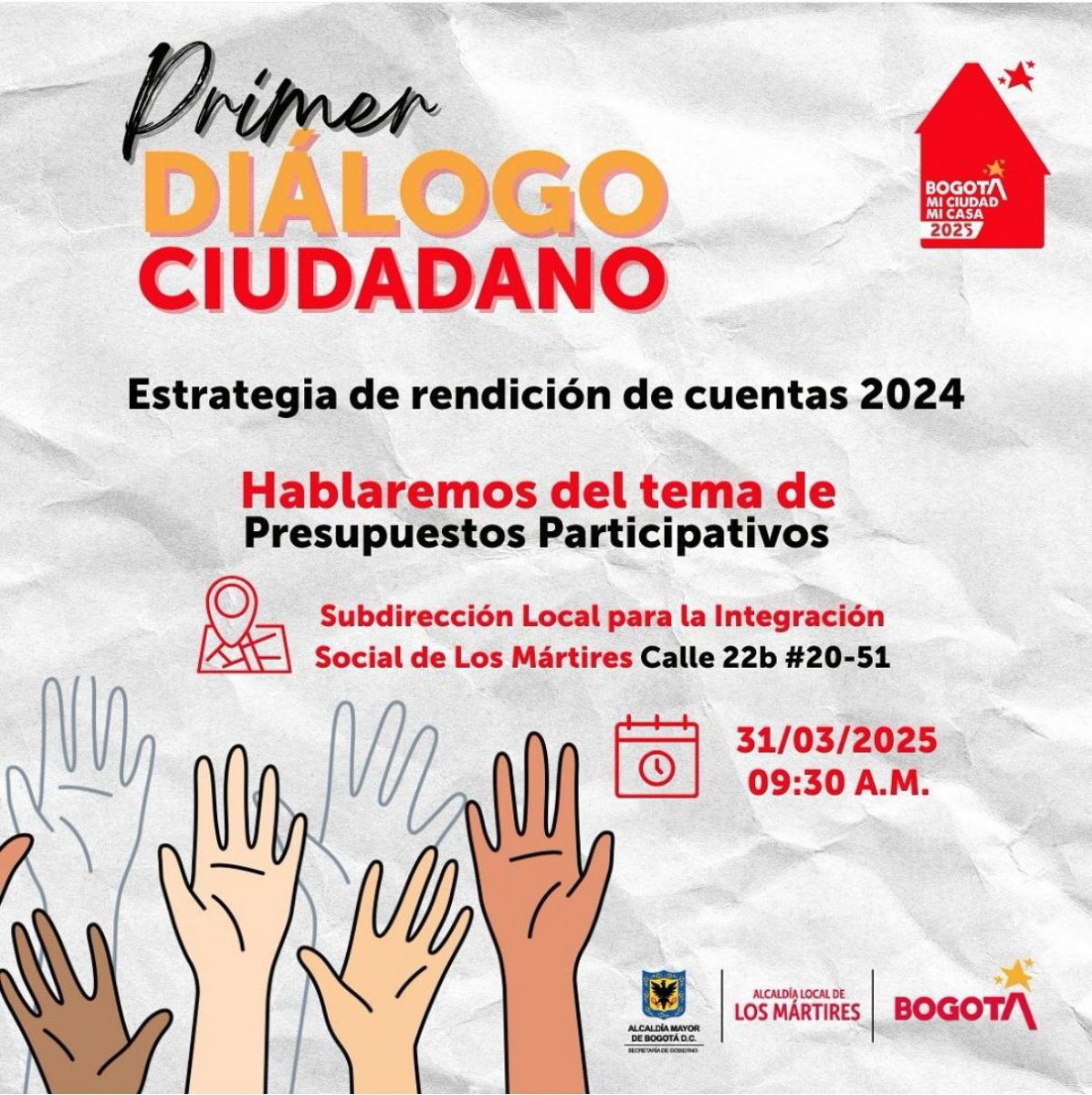 La Alcaldía Local de Los Mártires invita a la comunidad a participar en el Primer Diálogo Ciudadano, un espacio clave para la construcción colectiva sobre los Presupuestos Participativos, mecanismo que permite a los habitantes incidir en la distribución de los recursos públicos.