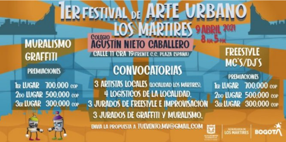 Llega a nuestra localidad de Los Mártires el Primer Festival de Arte Urbano, que se realizará el próximo 9 de abril en frente del colegio Agustín Nieto Caballero (ubicado en la calle 11 con carrera 19).