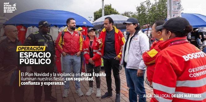 El Fondo de Desarrollo Local de Los Mártires puso en marcha el Plan Navidad en materia de recuperacion del Espacio Público, una estrategia territorial diseñada para fortalecer la seguridad, el orden y el buen uso del espacio público durante la temporada decembrina. Este operativo se concentró especialmente en los sectores comerciales de Plaza España y la calle 13, puntos de alta afluencia debido al incremento de visitantes y compradores durante esta época del año.