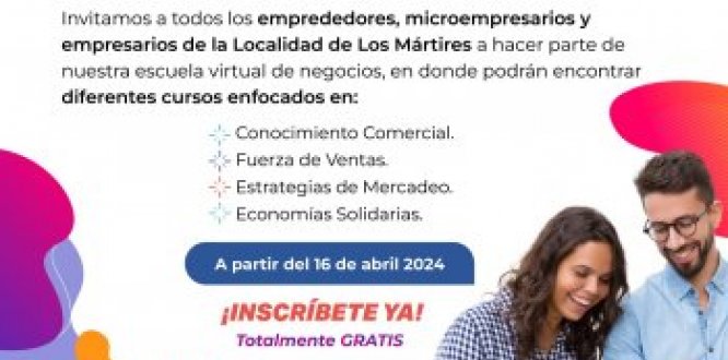 Invitamos a todos los emprendedores, microempresarios y empresarios de La Localidad de Los Mártires a hacer parte de nuestra escuela virtual de negocios, en donde podrán encontrar diferentes cursos enfocados en: